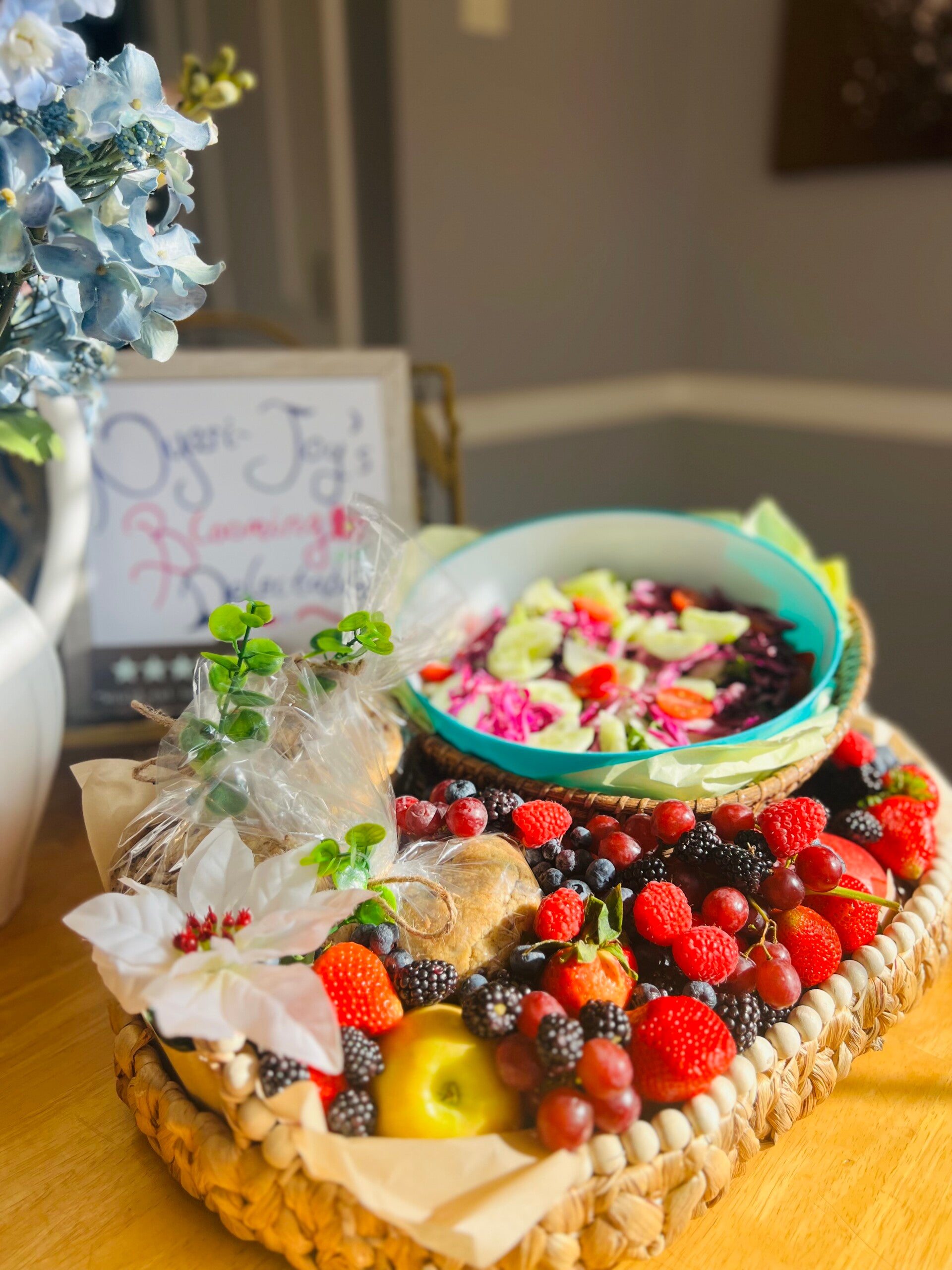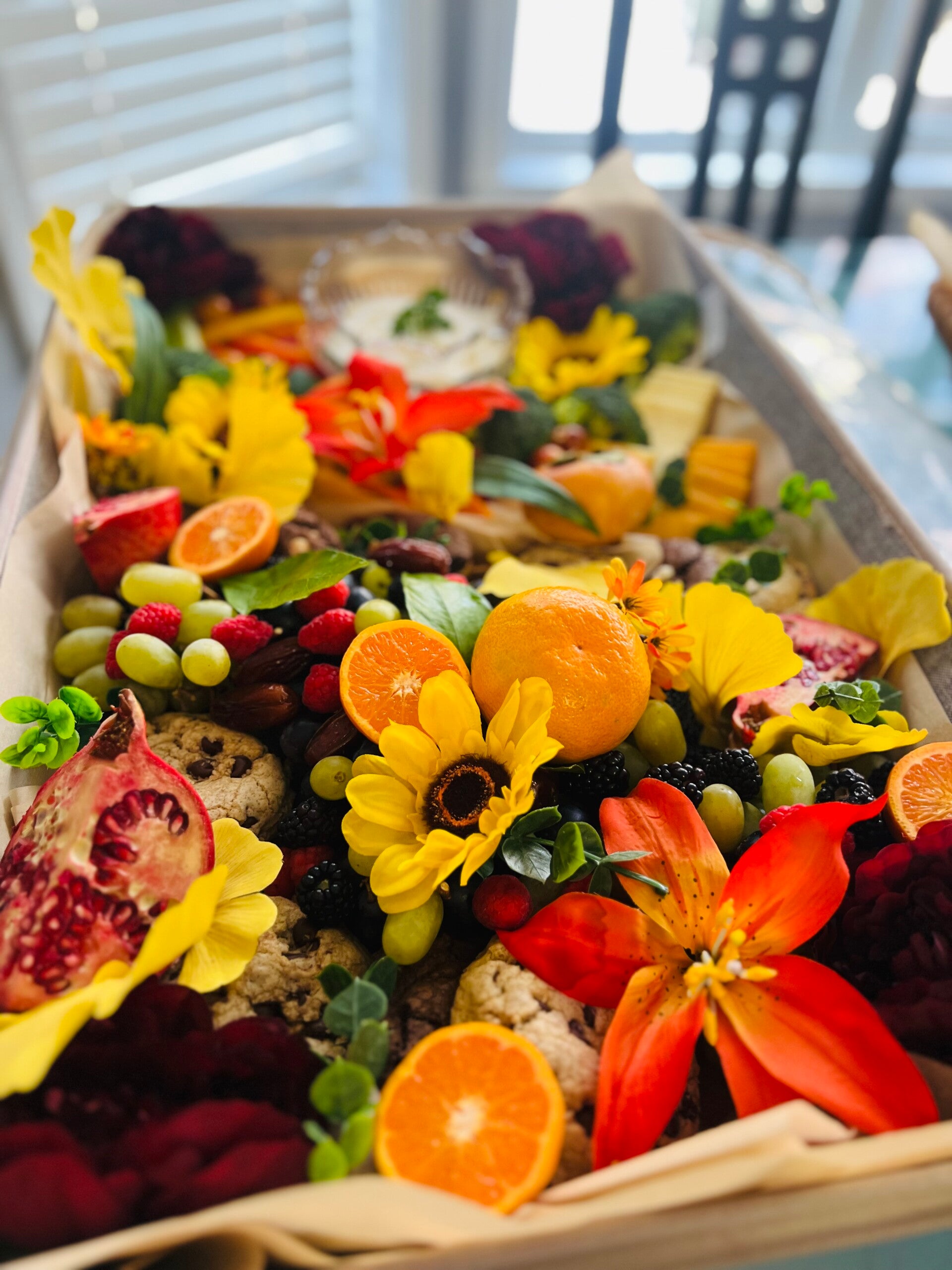 A feast of abundance, beauty, and grace. A stunning spread overflowing with fresh seasonal fruits, artisanal cheeses, crisp vegetables, and handcrafted gourmet cookies. Perfect for any celebration!